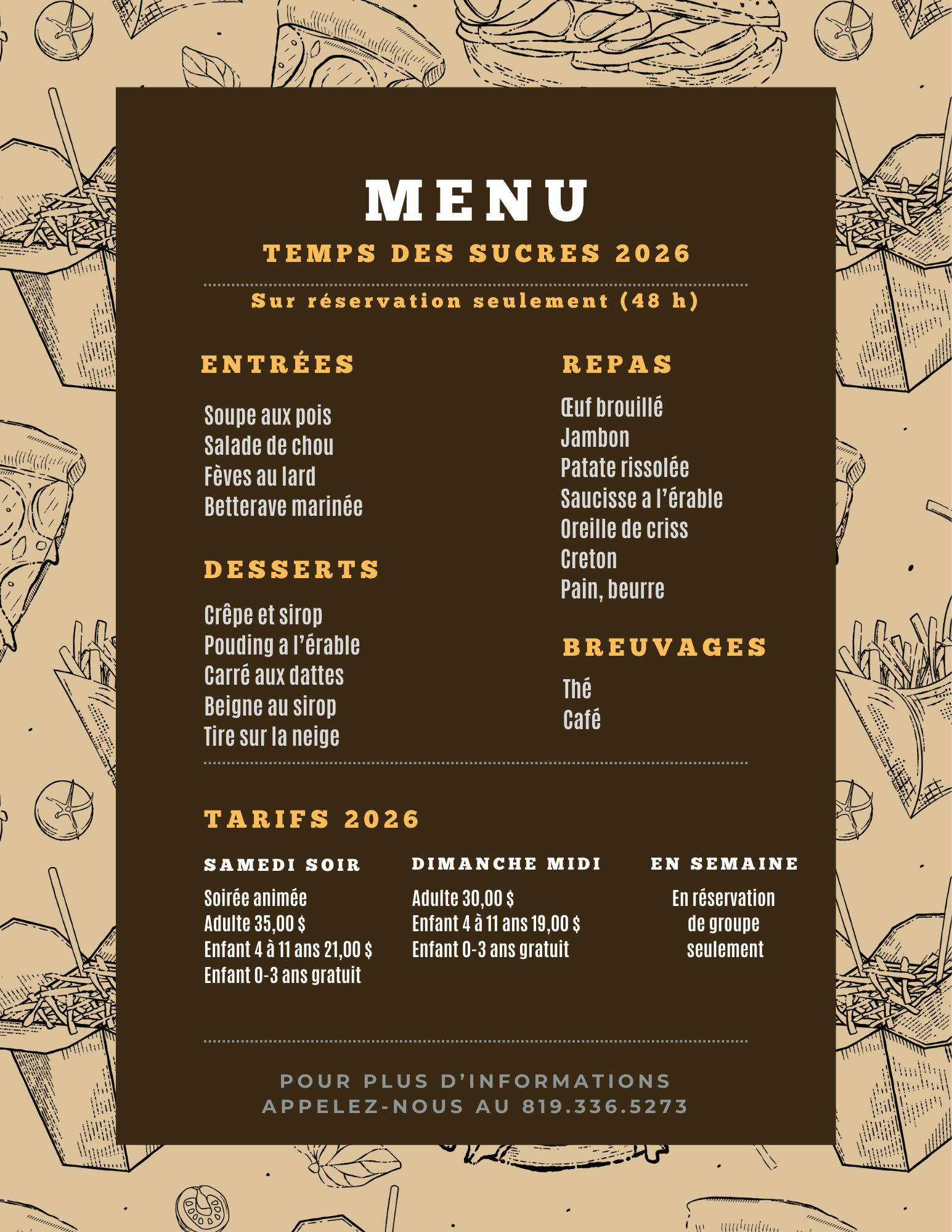 Venez célébrer le temps des sucres dans une ambiance conviviale et familiale, où petits et grands se retrouvent autour d’une généreuse cuisine traditionnelle. Ici, les saveurs d’érable sont à l’honneur, les plats sont préparés avec soin et l’accueil se fait comme à la maison.